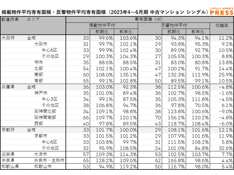 2023年4~6月期の近畿圏シングル向き中古マンションの掲載物件平均専有面積および反響物件平均専有面積は以下の通り。