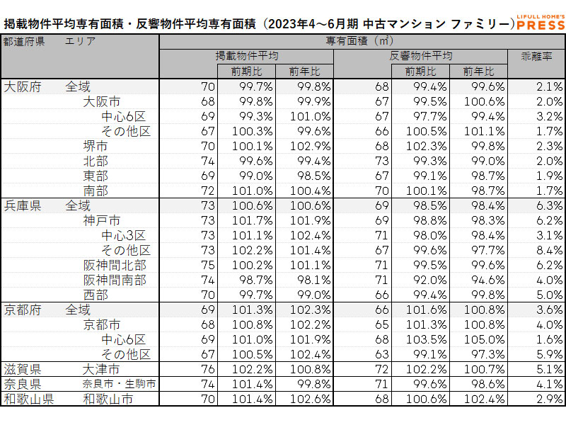 2023年4~6月期の近畿圏ファミリー向き中古マンションの掲載物件平均専有面積および反響物件平均専有面積は以下の通り。