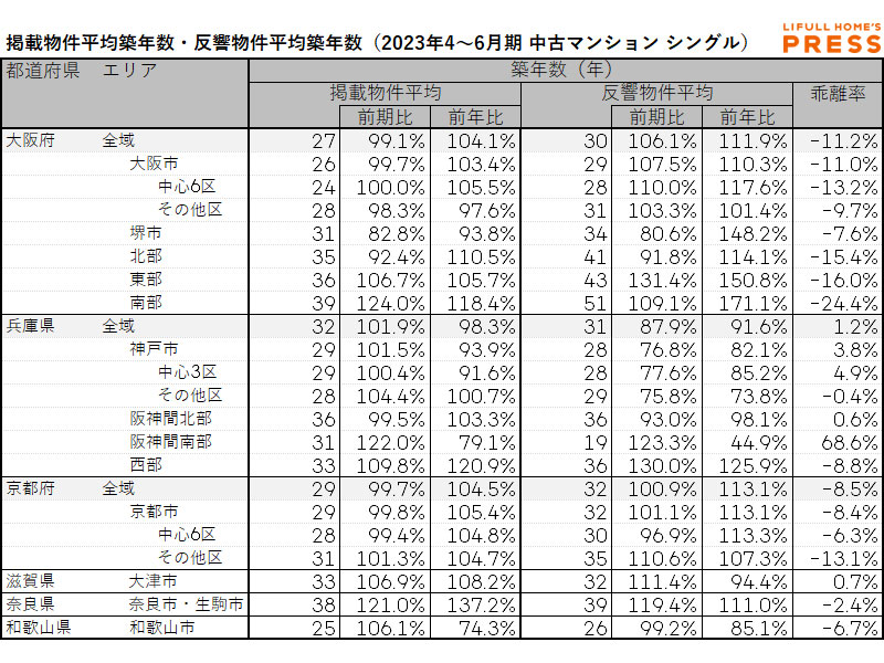 2023年4~6月期の近畿圏シングル向き中古マンションの掲載物件平均築年数および反響物件平均築年数は以下の通り。