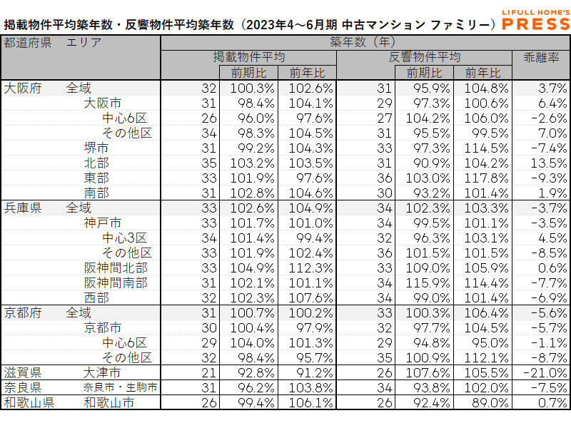 2023年4~6月期の近畿圏ファミリー向き中古マンションの掲載物件平均築年数および反響物件平均築年数は以下の通り。