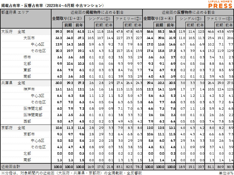 2023年4~6月期の近畿圏中古マンション市場における、各エリアの掲載占有率および反響占有率は以下の通り。