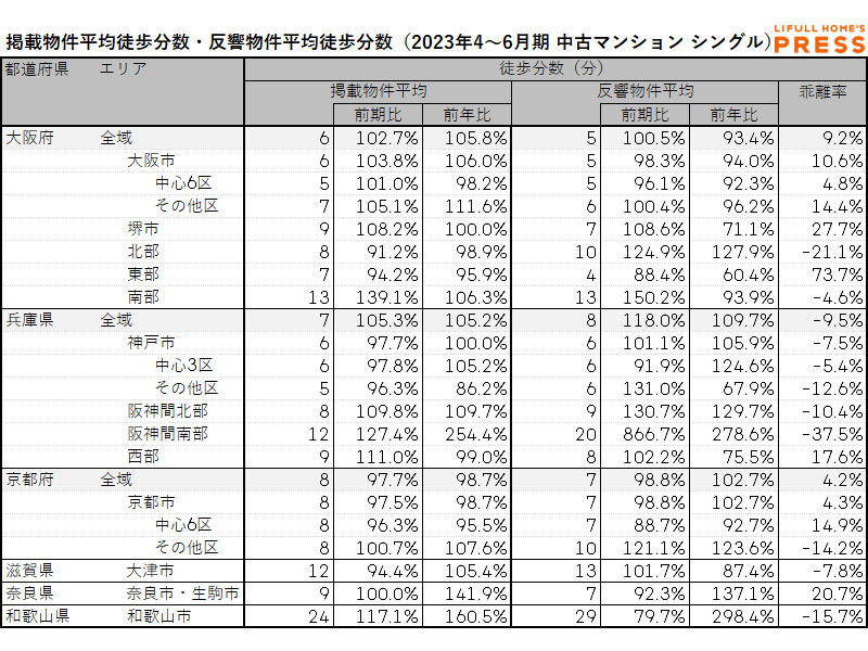 2023年4~6月期の近畿圏シングル向き中古マンションの掲載物件平均徒歩分数および反響物件平均徒歩分数は以下の通り。