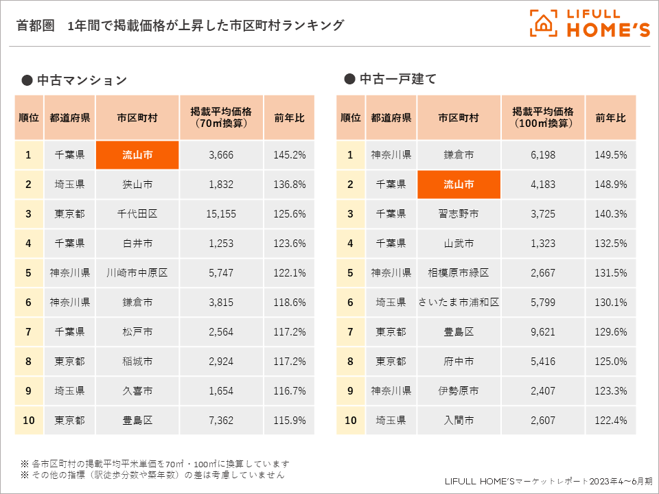 特に注目したいのが首都圏だ。千葉県流山市が中古マンションの上昇率で1位(前年比145.2%・70m2換算価格:3,666万円)となったほか、中古一戸建ての上昇率でも前年比148.9%(100m2換算価格:4,183万円)で2位にランクイン。なお、一戸建てランキングで流山市を抑えて1位となったのは神奈川県鎌倉市で、前年比149.5%(100m2換算価格:6,198万円)だった。