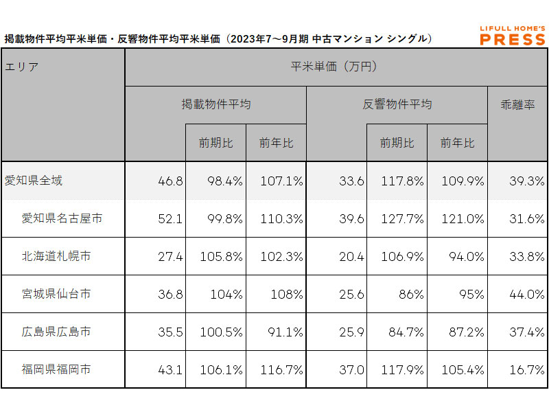 2023年7~9月期の愛知県および地方4市(札幌市、仙台市、広島市、福岡市)のシングル向き中古マンションの掲載物件平均価格および反響物件平均価格は以下の通り。