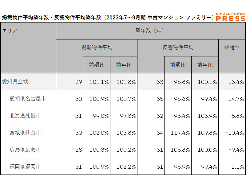 2023年7~9月期の愛知県および地方4市(札幌市、仙台市、広島市、福岡市)のファミリー向き中古マンションの掲載物件平均築年数および反響物件平均築年数は以下の通り。