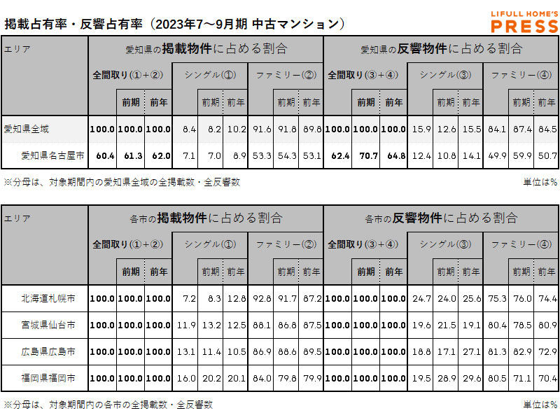 2023年7~9月期の愛知県および地方4市(札幌市・仙台市・広島市・福岡市)中古マンション市場における、各エリアの掲載占有率および反響占有率は以下の通り。