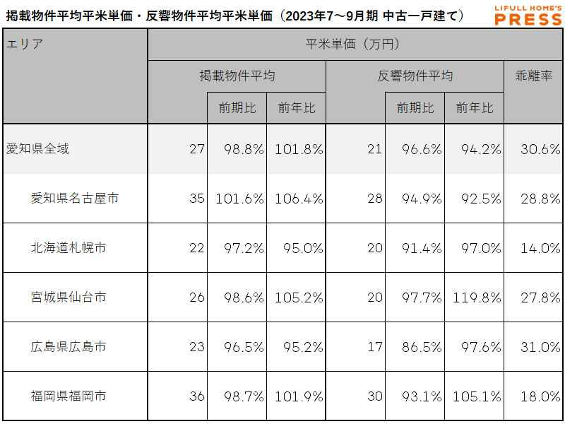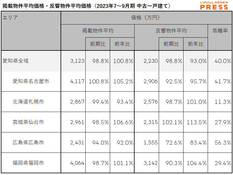 2023年7~9月期の愛知県および地方4市(札幌市、仙台市、広島市、福岡市)の中古一戸建ての掲載物件平均価格および反響物件平均価格は以下の通り。
