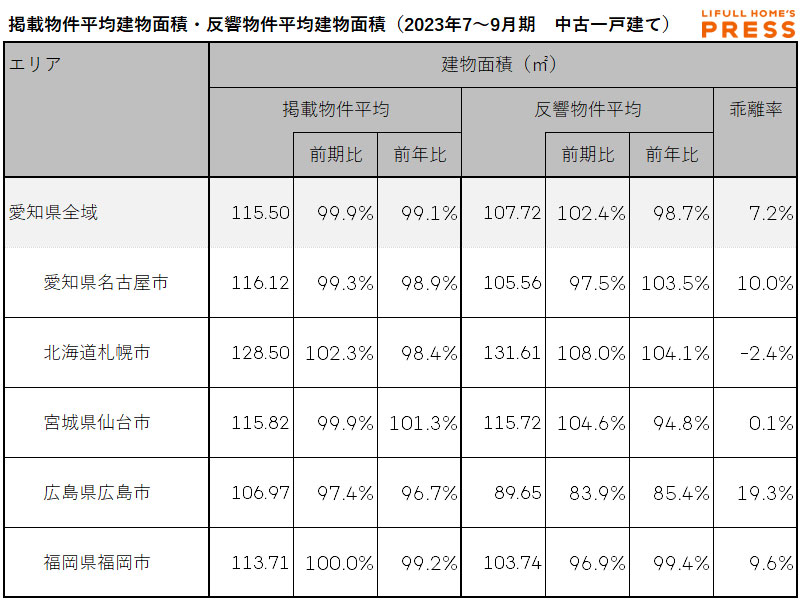 2023年7~9月期の愛知県および地方4市(札幌市、仙台市、広島市、福岡市)の中古一戸建ての掲載物件平均建物面積および反響物件平均建物面積は以下の通り。