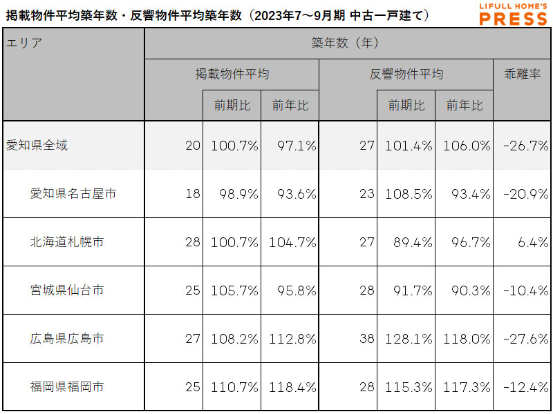2023年7~9月期の愛知県および地方4市(札幌市、仙台市、広島市、福岡市)の中古一戸建ての掲載物件平均築年数および反響物件平均築年数は以下の通り。
