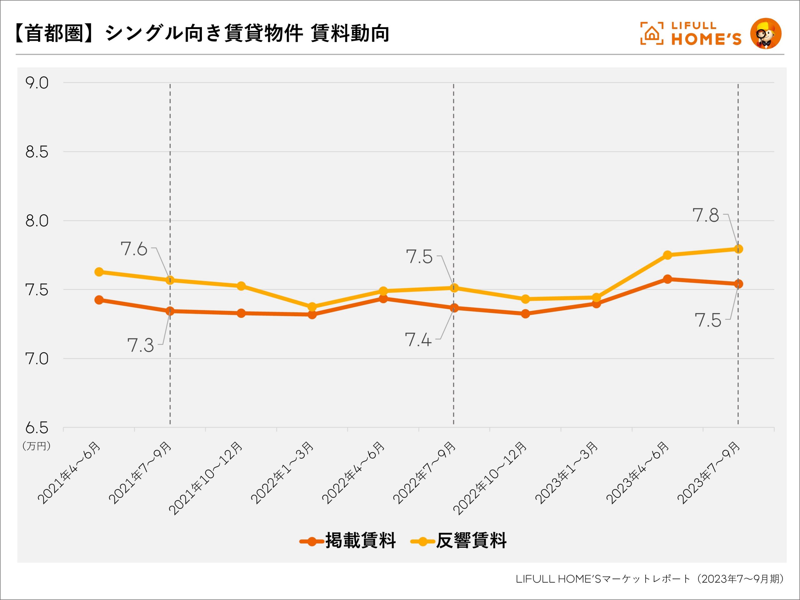 売買物件の価格上昇に伴うファミリー向き賃貸物件の需要増加などを背景に、特に首都圏では掲載賃料が大幅に上昇しているが、対して反響賃料の上昇は限定的であるなど、昨今の掲載賃料上昇に消費者の予算(コスト負担の許容度)が追い付いていない。そのような状況下で、長期空室リスクの高まる閑散期には、オーナーも強気の賃料設定をしにくいことなどから、今期は掲載賃料の上昇がやや抑制されたものと思われる。