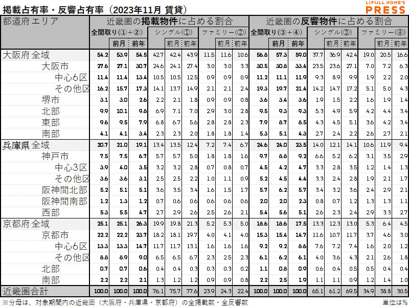 LIFULL HOME'Sマーケットレポートとは、LIFULL HOME'Sで掲載された物件データおよびユーザーがLIFULL HOME'Sを介して不動産会社に問合せた物件データをマーケットごとに公開するものである。本稿では、2023年11月に登録・公開された近畿圏の賃貸物件における以下のデータをまとめた。