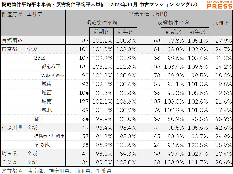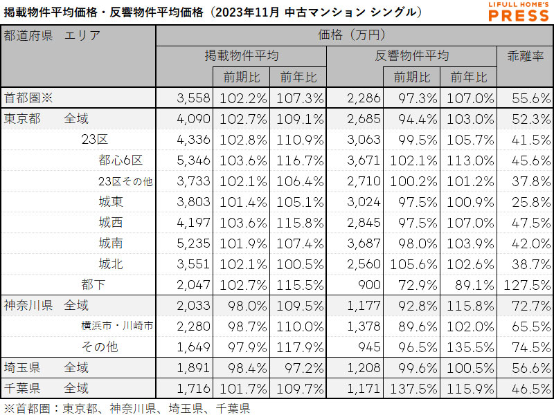 2023年11月の首都圏シングル向き中古マンションの掲載物件平均価格および反響物件平均価格は以下の通り。