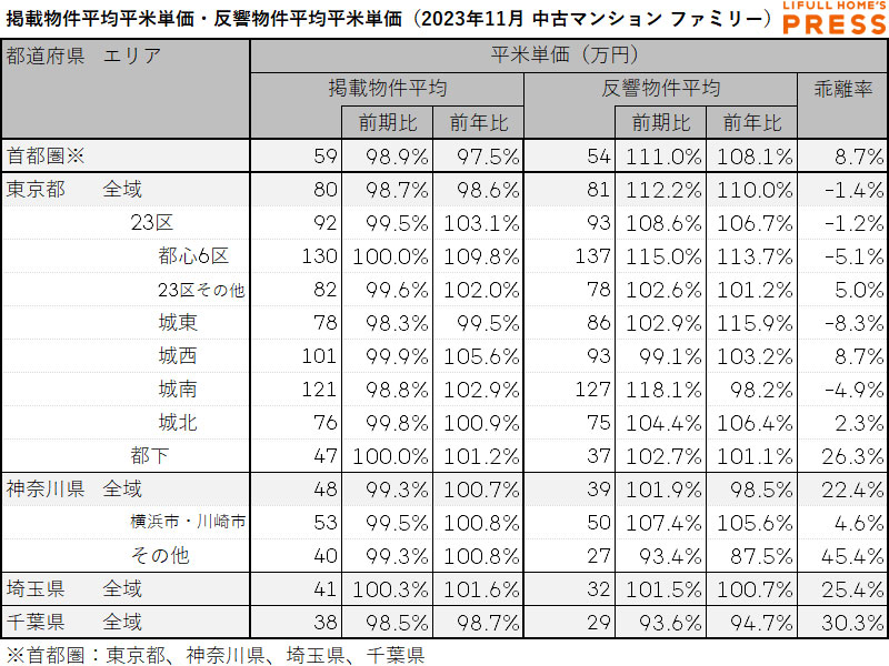 2023年11月の首都圏ファミリー向き中古マンションの掲載物件平均価格および反響物件平均価格は以下の通り。