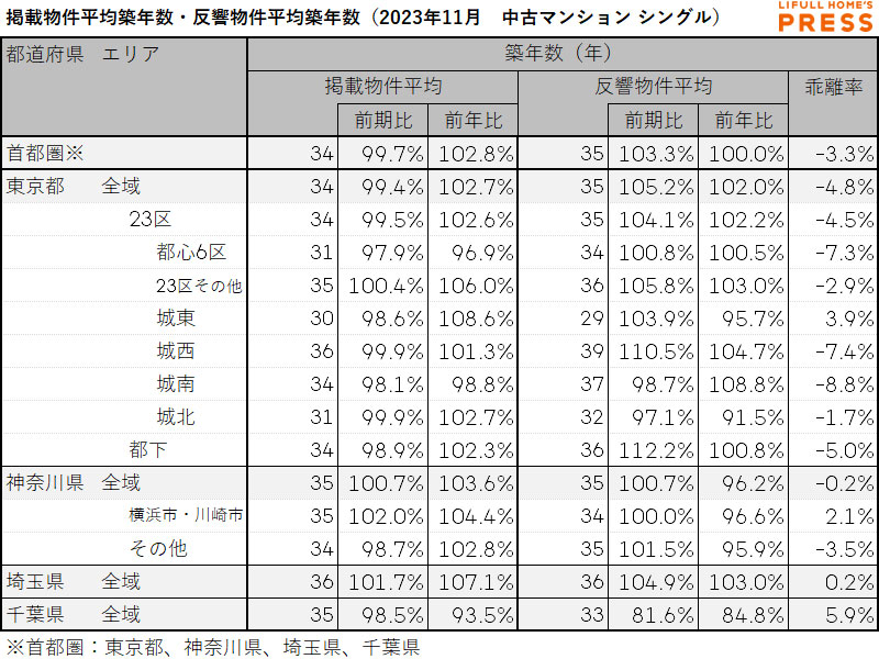 2023年11月の首都圏シングル向き中古マンションの掲載物件平均築年数および反響物件平均築年数は以下の通り。