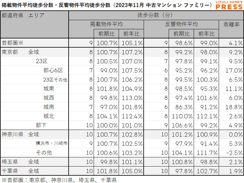 2023年11月の首都圏ファミリー向き中古マンションの掲載物件平均徒歩分数および反響物件平均徒歩分数は以下の通り。