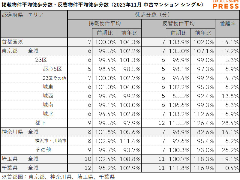 2023年11月の首都圏シングル向き中古マンションの掲載物件平均徒歩分数および反響物件平均徒歩分数は以下の通り。