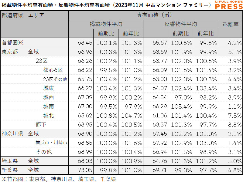 2023年11月の首都圏ファミリー向き中古マンションの掲載物件平均専有面積および反響物件平均専有面積は以下の通り。