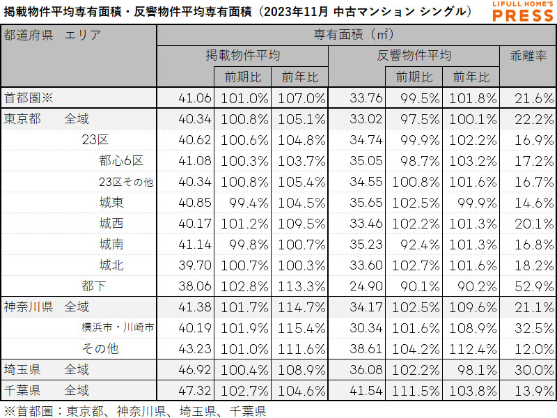 2023年11月の首都圏シングル向き中古マンションの掲載物件平均専有面積および反響物件平均専有面積は以下の通り。