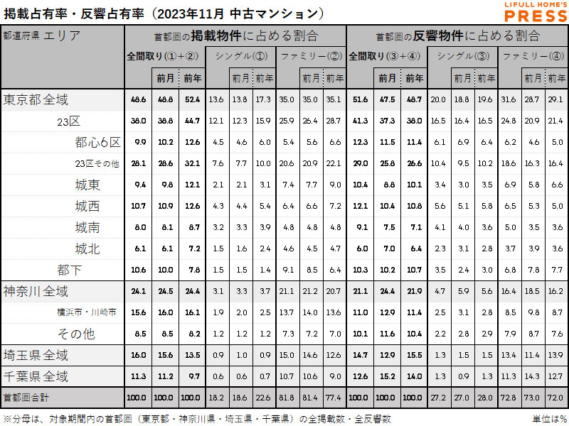 LIFULL HOME'Sマーケットレポートとは、LIFULL HOME'Sで掲載された物件データおよびユーザーがLIFULL HOME'Sを介して不動産会社に問合せた物件データをマーケットごとに公開するものである。本稿では、2023年11月に登録・公開された首都圏の中古マンションにおける以下のデータをまとめた。