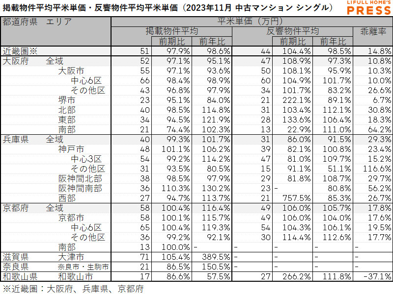 2023年11月の近畿圏シングル向き中古マンションの掲載物件平均価格および反響物件平均価格は以下の通り。