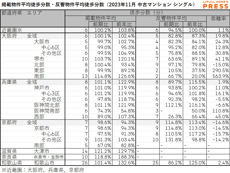 2023年11月の近畿圏シングル向き中古マンションの掲載物件平均徒歩分数および反響物件平均徒歩分数は以下の通り。