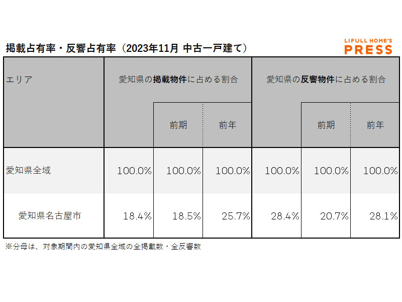 2023年11月の愛知県および地方4市(札幌市、仙台市、広島市、福岡市)の中古一戸建ての掲載物件平均価格および反響物件平均価格は以下の通り。