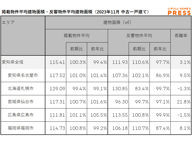 2023年11月期の愛知県および地方4市(札幌市、仙台市、広島市、福岡市)の中古一戸建ての掲載物件平均建物面積および反響物件平均建物面積は以下の通り。