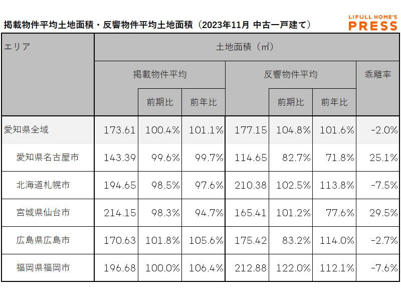 2023年11月期の愛知県および地方4市(札幌市、仙台市、広島市、福岡市)の中古一戸建ての掲載物件土地建物面積および反響物件平均土地面積は以下の通り。