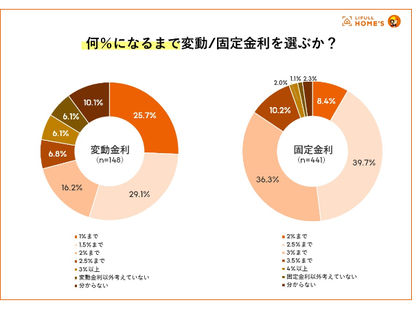何%まで変動金利を組むか?について聞いたところ、「変動金利」の場合、最も多かった回答が「1.5%まで」(29.1%)、その次に「1%まで」(25.7%)が続き、この2つで過半数を占めた。「固定金利」では最も多かった回答が「2.5%まで」(39.7%)、僅差で「3%まで」(36.3%)が続いた。