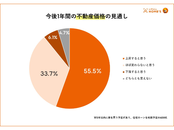 ウクライナ侵攻や円安などを背景に近年上昇を続けてきた住宅価格だが、今後1年間についても過半数が引き続き「上昇すると思う」と回答。「下落すると思う」と回答したのは1割にも満たず、厳しい見方をしている人が多いことが浮き彫りとなった。