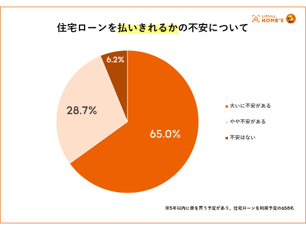 住宅ローンの支払いについては65.0%が「大いに不安がある」、28.7%が「やや不安がある」と回答し、大多数が多かれ少なかれ不安を抱いていることが分かった。