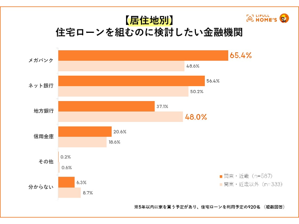 住宅ローンを組むにあたって、検討したい金融機関を居住地別で見たところ、関東・近畿圏では「メガバンク」(65.4%)が最も多く、続いて「ネット銀行」(56.4%)、「地方銀行」は半数を下回った。一方で関東・近畿圏外では「ネット銀行」(50.2%)、「メガバンク」(48.6%)、「地方銀行」(48.0%)が2%ほどの差で拮抗した。