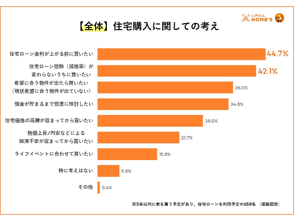 住宅購入に関しての考えについて聞いたところ、1位が「住宅ローン金利が上がる前に買いたい」(44.7%)、続いて「住宅ローン控除(減税率)が変わらないうちに買いたい」(42.1%)と、住宅ローンに関する選択肢が上位を占めた。