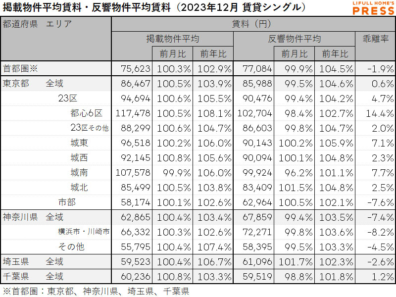 2023年12月の首都圏シングル向き賃貸物件の掲載物件平均賃料および反響物件平均賃料は以下の通り。