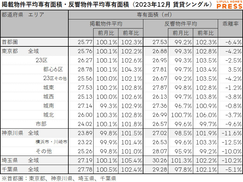 2023年12月の首都圏シングル向き賃貸物件の掲載物件平均専有面積および反響物件平均専有面積は以下の通り。