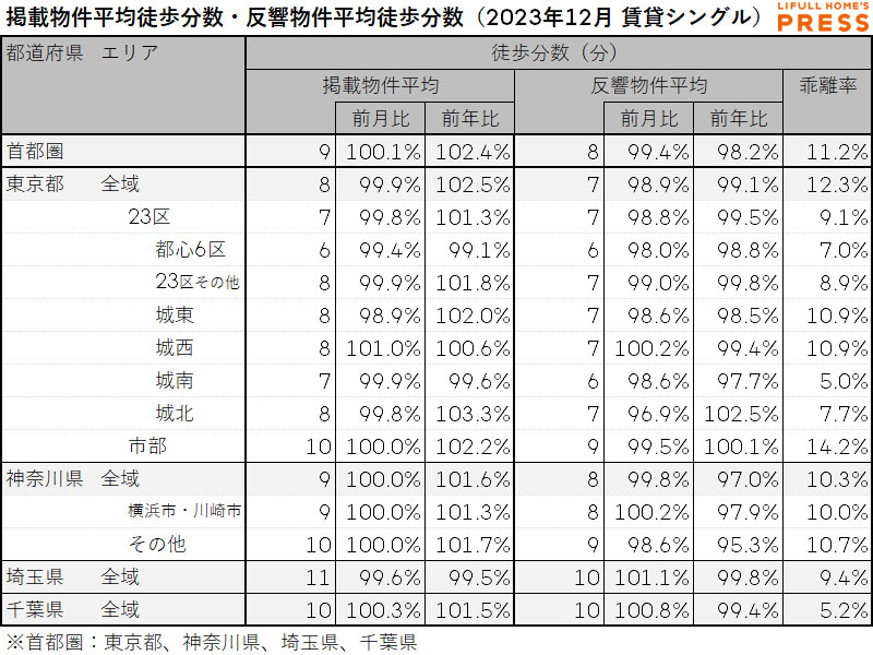 2023年12月の首都圏ファミリー向き賃貸物件の掲載物件平均徒歩分数および反響物件平均徒歩分数は以下の通り。