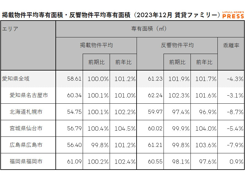 2023年12月の愛知県および地方4市(札幌市、仙台市、広島市、福岡市)のファミリー向き賃貸物件の掲載物件平均専有面積および反響物件平均専有面積は以下の通り。