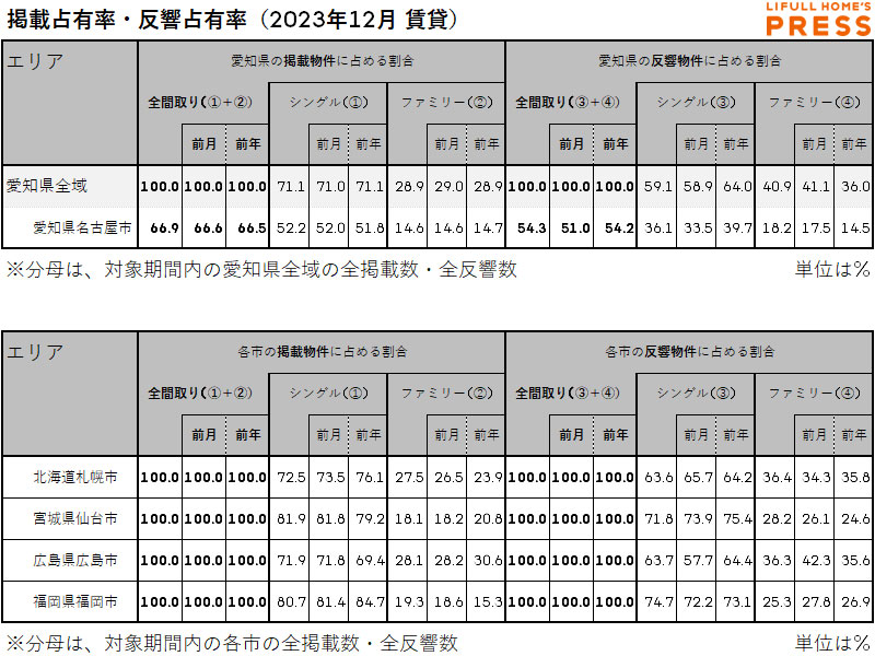 2023年12月の愛知県および地方4市(札幌市、仙台市、広島市、福岡市)賃貸物件市場における、各エリアの掲載占有率および反響占有率は以下の通り。