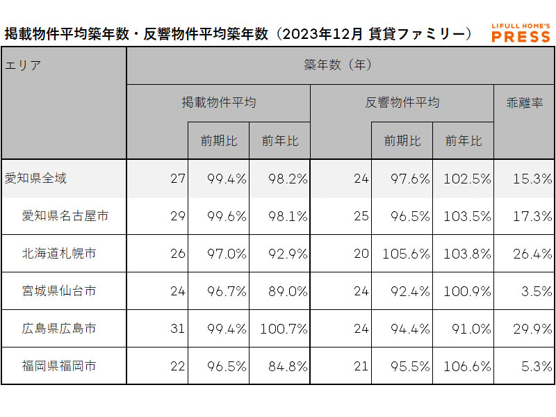 2023年12月の愛知県および地方4市(札幌市、仙台市、広島市、福岡市)のファミリー向き賃貸物件の掲載物件平均築年数および反響物件平均築年数は以下の通り。