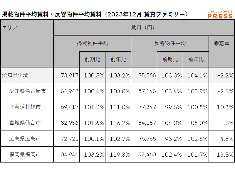 2023年12月の愛知県および地方4市(札幌市、仙台市、広島市、福岡市)のファミリー向き賃貸物件の掲載物件平均賃料および反響物件平均賃料は以下の通り。