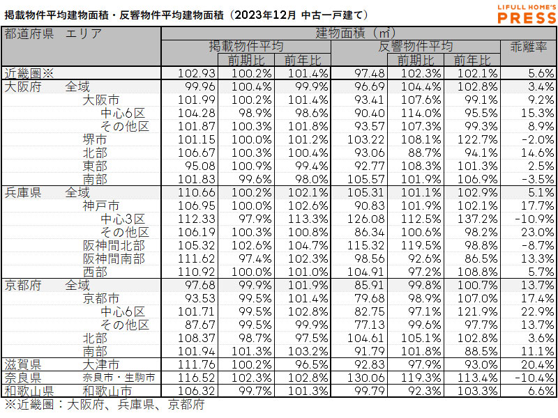 2023年12月の近畿圏中古一戸建ての掲載物件平均価格および反響物件平均価格は以下の通り。