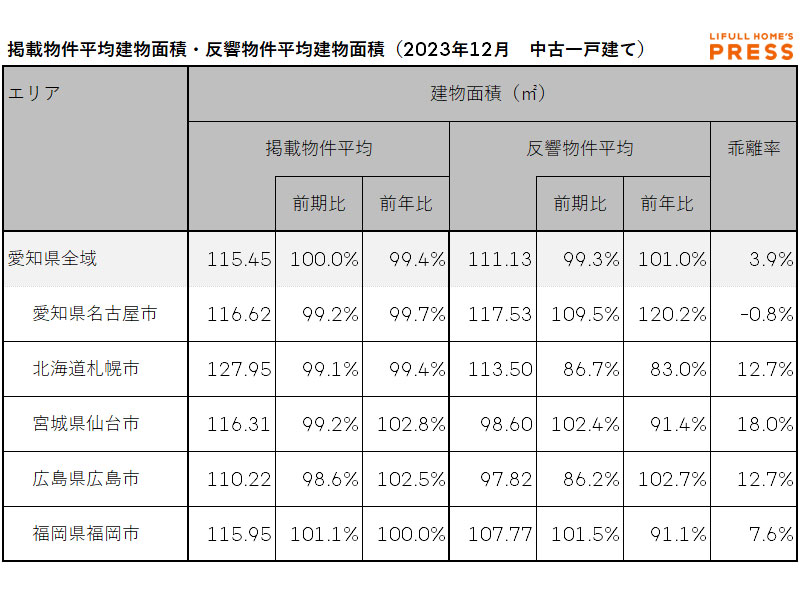 2023年12月期の愛知県および地方4市(札幌市、仙台市、広島市、福岡市)の中古一戸建ての掲載物件平均建物面積および反響物件平均建物面積は以下の通り。