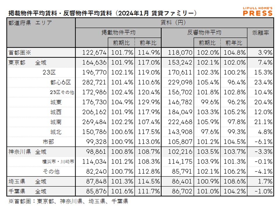 2024年1月の首都圏ファミリー向き賃貸物件の掲載物件平均賃料および反響物件平均賃料は以下の通り。