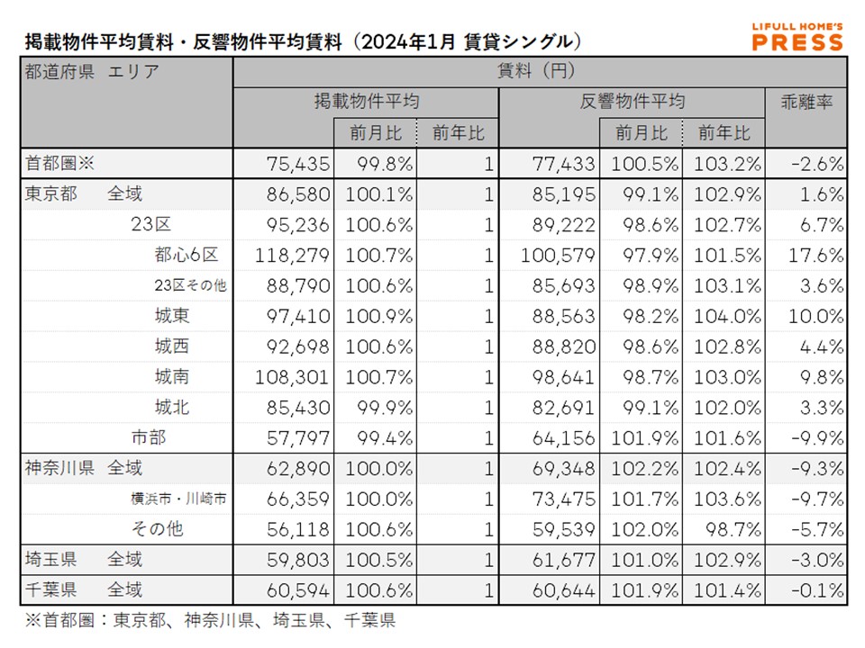 2024年1月の首都圏シングル向き賃貸物件の掲載物件平均賃料および反響物件平均賃料は以下の通り。