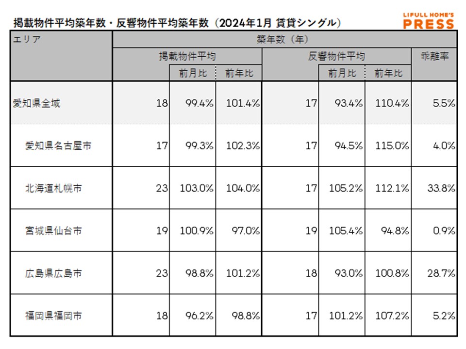 2024年1月の愛知県および地方4市(札幌市、仙台市、広島市、福岡市)のシングル向き賃貸物件の掲載物件平均築年数および反響物件平均築年数は以下の通り。