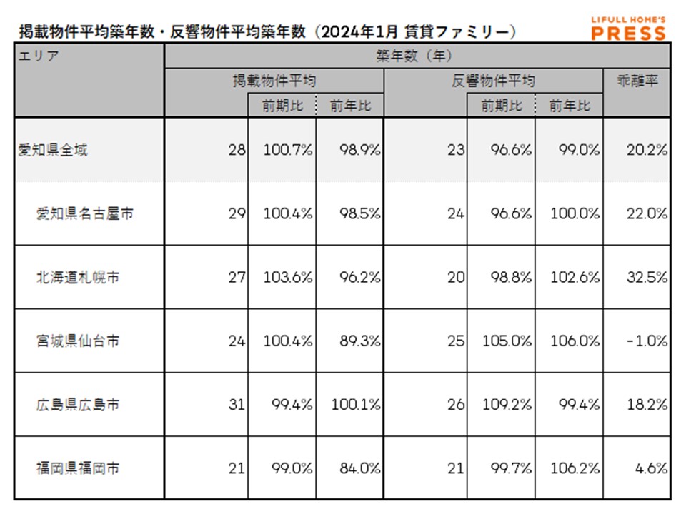 2024年1月の愛知県および地方4市(札幌市、仙台市、広島市、福岡市)のファミリー向き賃貸物件の掲載物件平均築年数および反響物件平均築年数は以下の通り。