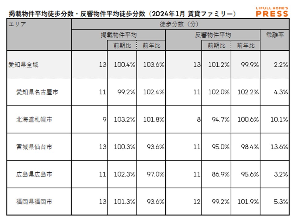 2024年1月の愛知県および地方4市(札幌市、仙台市、広島市、福岡市)のファミリー向き賃貸物件の掲載物件平均徒歩分数および反響物件平均徒歩分数は以下の通り。