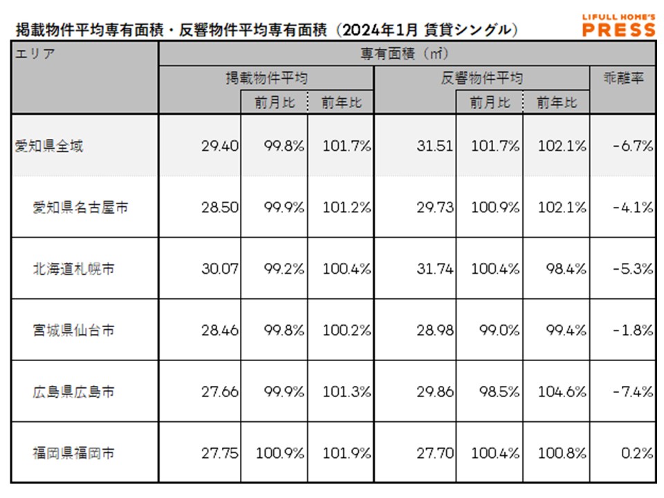 2024年1月の愛知県および地方4市(札幌市、仙台市、広島市、福岡市)のシングル向き賃貸物件の掲載物件平均専有面積および反響物件平均専有面積は以下の通り。