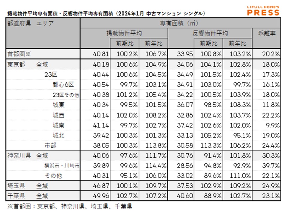 2024年1月の首都圏シングル向き中古マンションの掲載物件平均専有面積および反響物件平均専有面積は以下の通り。
