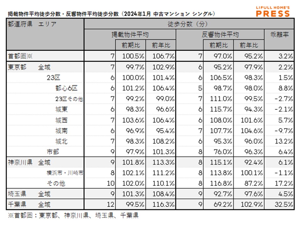 2024年1月の首都圏シングル向き中古マンションの掲載物件平均徒歩分数および反響物件平均徒歩分数は以下の通り。